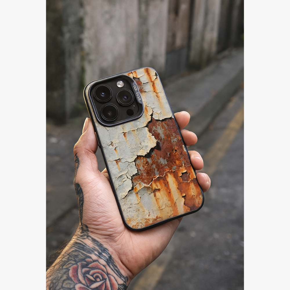 La Verrostete Wandhülle ist für alle gedacht, die eine urbane, raue und authentische Ästhetik lieben. Das Muster in Rostoptik und abgeblätterter Farbe schafft eine einzigartige visuelle Textur, die an Industriewände und von der Zeit abgenutzte Details erinnert. Diese rohe, aber elegante Hülle verwandelt Ihr iPhone in ein stilvolles Accessoire mit starkem Charakter, perfekt für alle, die etwas anderes, Echtes und mit Persönlichkeit suchen.