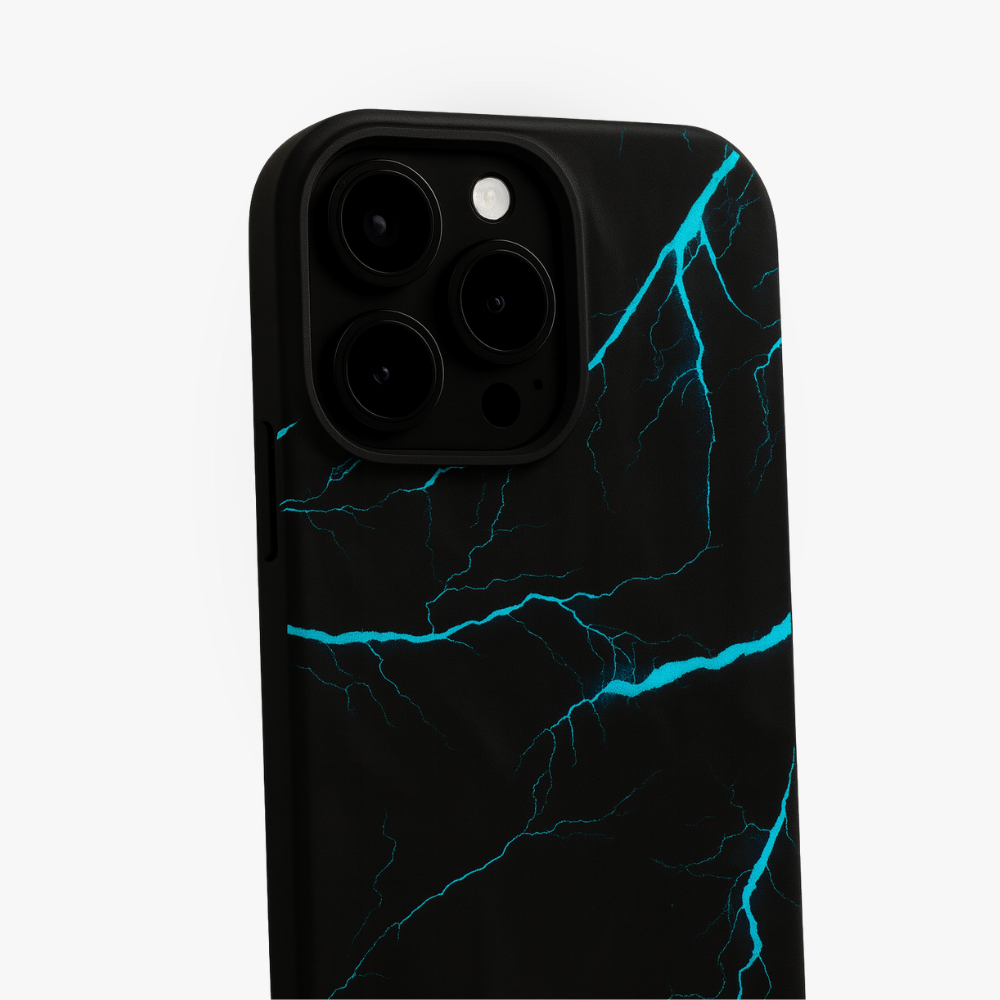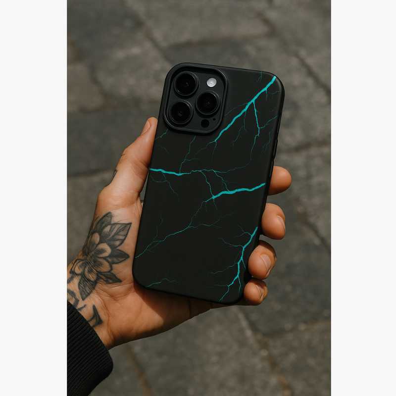 La Étui Neon Thunder Elle est conçue pour ceux qui aiment l'esthétique électrique, moderne et hors des sentiers battus. Le motif de foudre turquoise sur fond noir mat crée un contraste puissant et visuellement magnétique, comme une décharge d'énergie dans votre main. Minimaliste mais percutante, cette coque transforme votre iPhone en un accessoire de caractère, parfait pour ceux qui veulent se faire remarquer sans renoncer au raffinement.