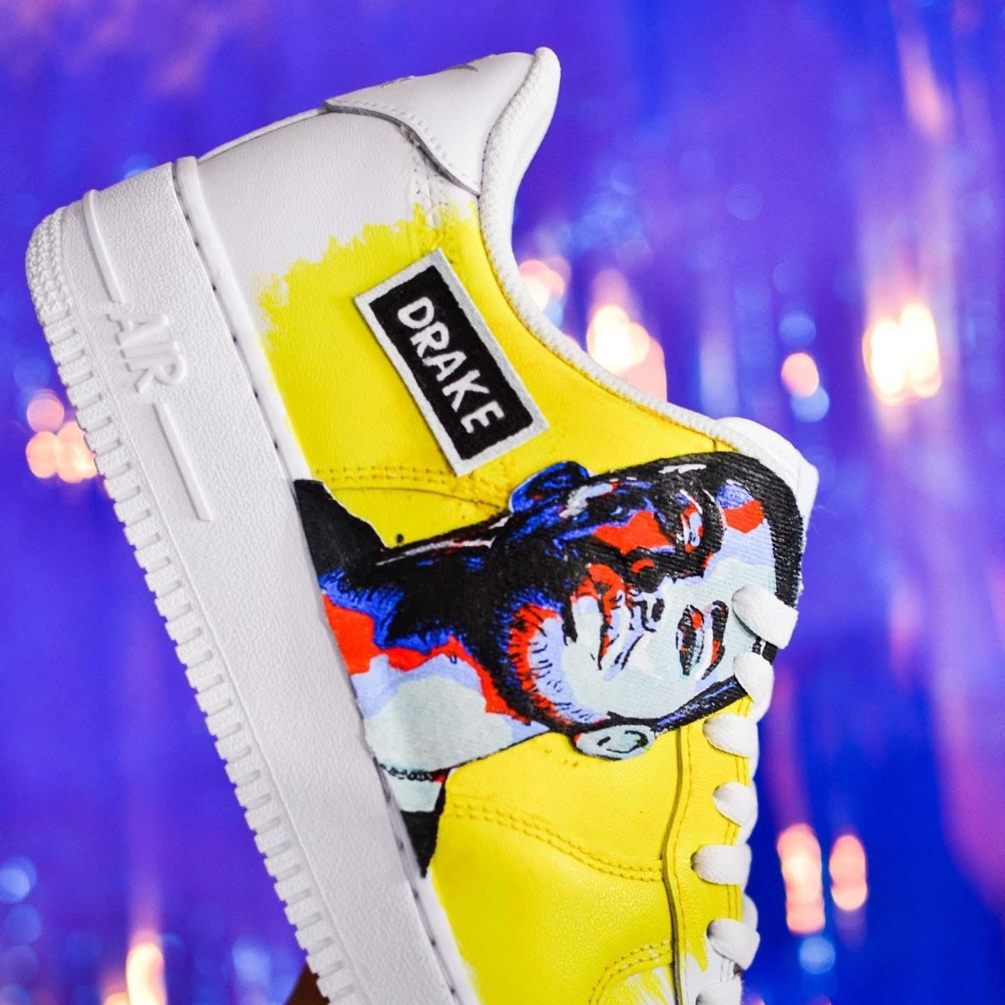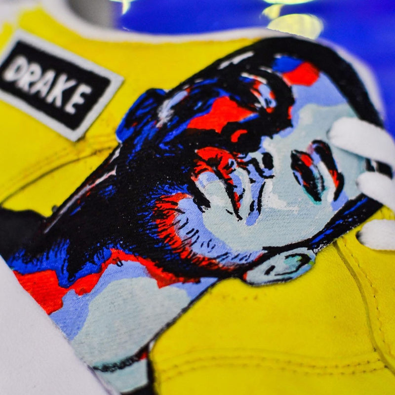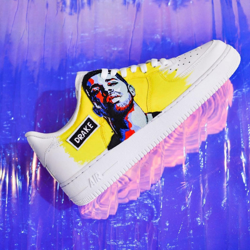 Un tributo audace a uno degli artisti più influenti della scena mondiale. Questa Air Force 1 è dipinta a mano con un ritratto stilizzato di Drake, immerso in tonalità vibranti e fondo giallo energico. Un pezzo unico che unisce urban culture e arte contemporanea.